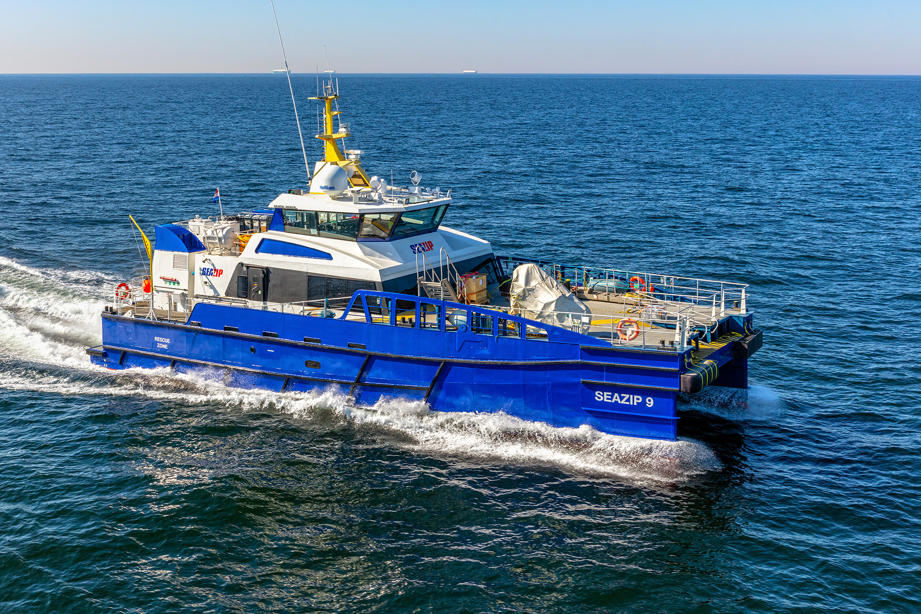 CTV SeaZip 9 is a fast Twin Axe Bow catamaran (DAMEN FCS 2710) for transport of Industrial Personnel, equipment and parts to offshore windfarms and oil & gas fields.