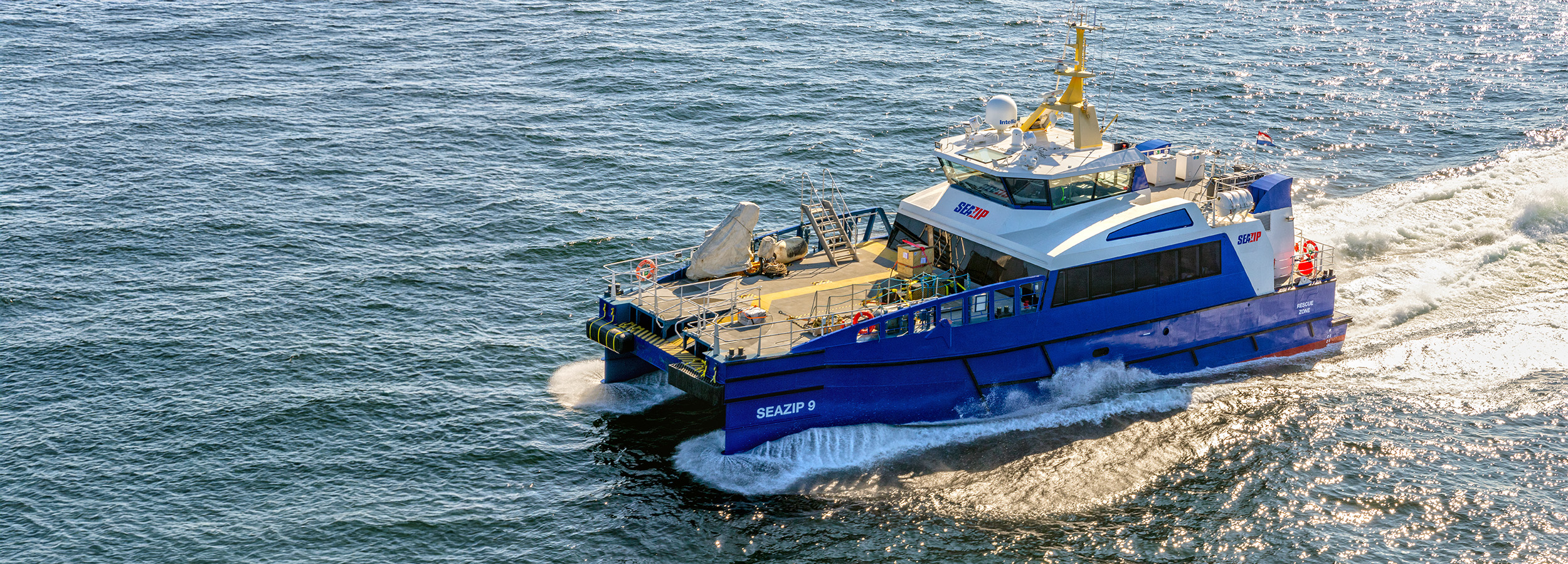 CTV SeaZip 9 is a fast Twin Axe Bow catamaran (DAMEN FCS 2710) for transport of Industrial Personnel, equipment and parts to offshore windfarms and oil & gas fields.